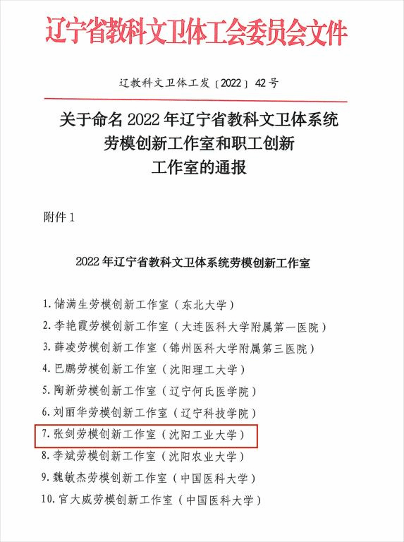 日前,辽宁省教科文卫体工会委员会发布《关于命名2022年辽宁省教科文卫体系统劳模创新工作室和职工创新工作室的通报》,命名10个劳模创新工作室、30个职工创新工作室,我校机械工程学院张剑创新工作室被命名为辽宁省教科文卫体系统劳模创新工作室。
