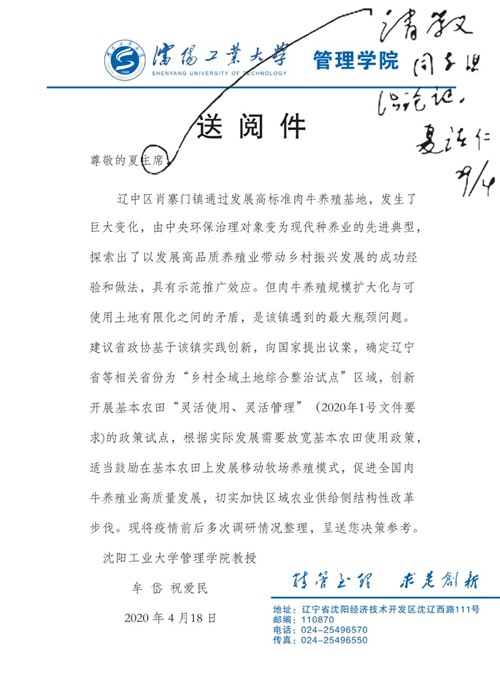 为深入研究国家提出创新开展基本农田“灵活使用,灵活管理”的要求,管理学院特聘教授牟岱和祝爱民院长从2020年初开始,多次深入我省农村基层开展调查研究活动,针对我省高品质肉牛养殖基地辽中区肖寨门镇大力发展种养结合过程中,在乡村全域土地综合治理过程中形成的管理经验和遇到的管理问题,进行了半年多的个案研究,形成了研究报告,提出了我省和国家在土地资源和产业发展管理问题上,应该根据实际发展需要放宽基本农田使用管理政策,适当鼓励在基本农田上发展移动牧场养殖模式,推动种养结合的生态循环经济,促进全国肉牛养殖高质量发展和种植业生态科学化发展,切实加快区域农业供给侧结构性改革步伐。该报告得到了辽宁省政协夏德仁主席、沈阳市市长姜有为、沈阳市副市长王广生的重要批示,并组成省政协、环保厅、自然资源厅、省农科院、市政协等有关部门专家参加的联合调研组,进行了调研论证,肯定了种养结合的发展方向和肖寨门镇的可借鉴性的管理经验,并决定将肖寨门镇纳入明年的试点,进一步通过试点确定种养结合发展涉及到的土地管理、产业管理、生态管理、科技管理和人才管理的有关政策。