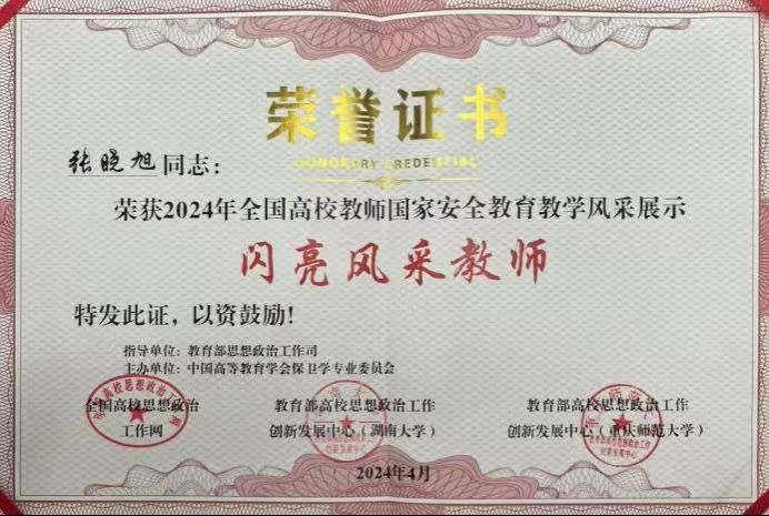 4月10日至12日,由教育部思想政治工作司指导,中国高等教育学会保卫学专业委员会、全国高校思想政治工作网等单位联合主办的全国高校教师国家安全教育教学风采现场展示活动在重庆师范大学举行。现场展示活动共评选出特别展示教师6位,闪亮风采教师14位,优秀风采教师17位,我校辅导员张晓旭获评“闪亮风采教师”,进入全国20强,这也是学校首次在全国高校国家安全教育教学风采展示活动中获奖,实现历史性突破。
