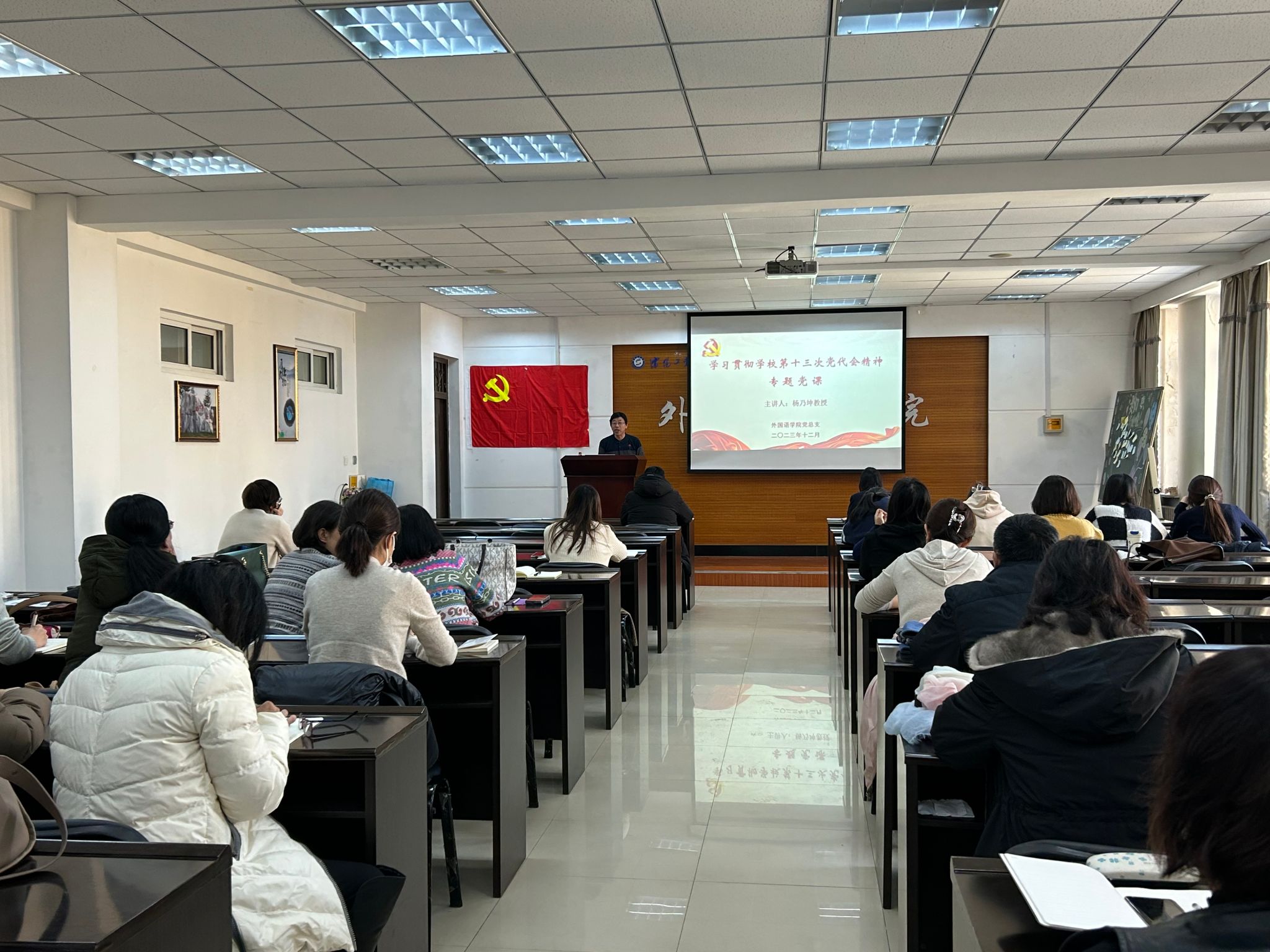 12月20日下午,为更加深入学习学校第十三次党代会精神,外国语学院党总支于文科楼419会议室组织开展专题党课,党课邀请马克思主义学院杨乃坤教授进行讲授,学院全体党员参加。