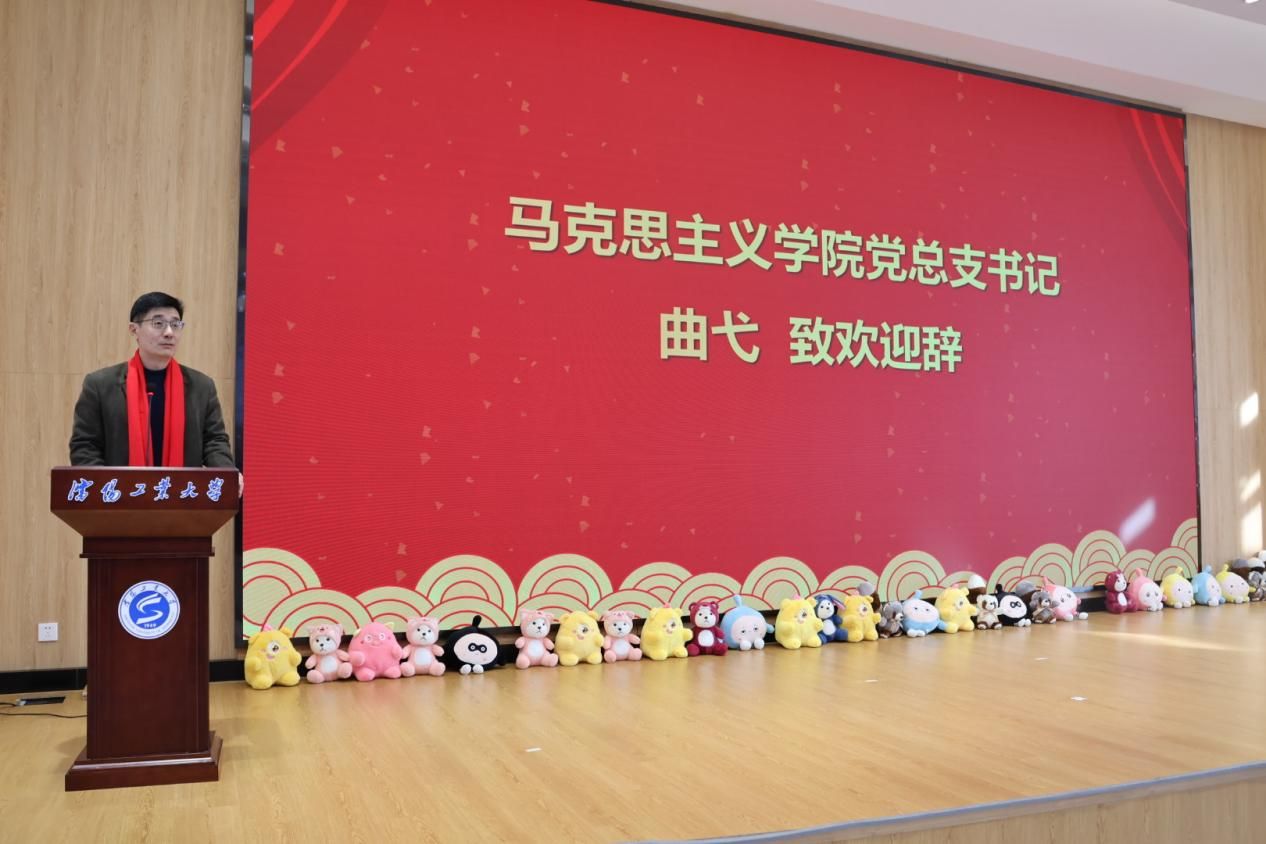 活动伊始,马克思主义学院党总支书记曲弋致辞。他表示,在过去的一年里,马克思主义学院取得了优异的成绩,成功入选为辽宁省第二批高校示范马克思主义学院,在明确新的研究方向的同时与相关单位签订了大思政课实践教学基地协议,承办了一系列省市级大型活动。此外,学院在党建、教学、科研等工作中也取得了长足的发展和进步,国社科、省社科基金项目稳中求进。今年,学院成立师生宣讲团并成功举办了主题宣讲会、“四个自信”虚拟实践教学中心正式投入使用并开展了丰富多彩的主题活动。最后,他号召全院师生要着力发挥学院理论研究和宣传传播优势,传承红色基因,厚植工大精神,推动大中小思政课一体化建设,加强辐射带动作用,将马克思主义学院建院10周年与工大建校75周年庆祝纪念活动充分融合,以建院10周年为新的起点,勇于进取、一马当先,提升办学水平,打造学院文化,以崭新的面貌和昂扬向上的姿态来面对新一年的机遇与挑战。