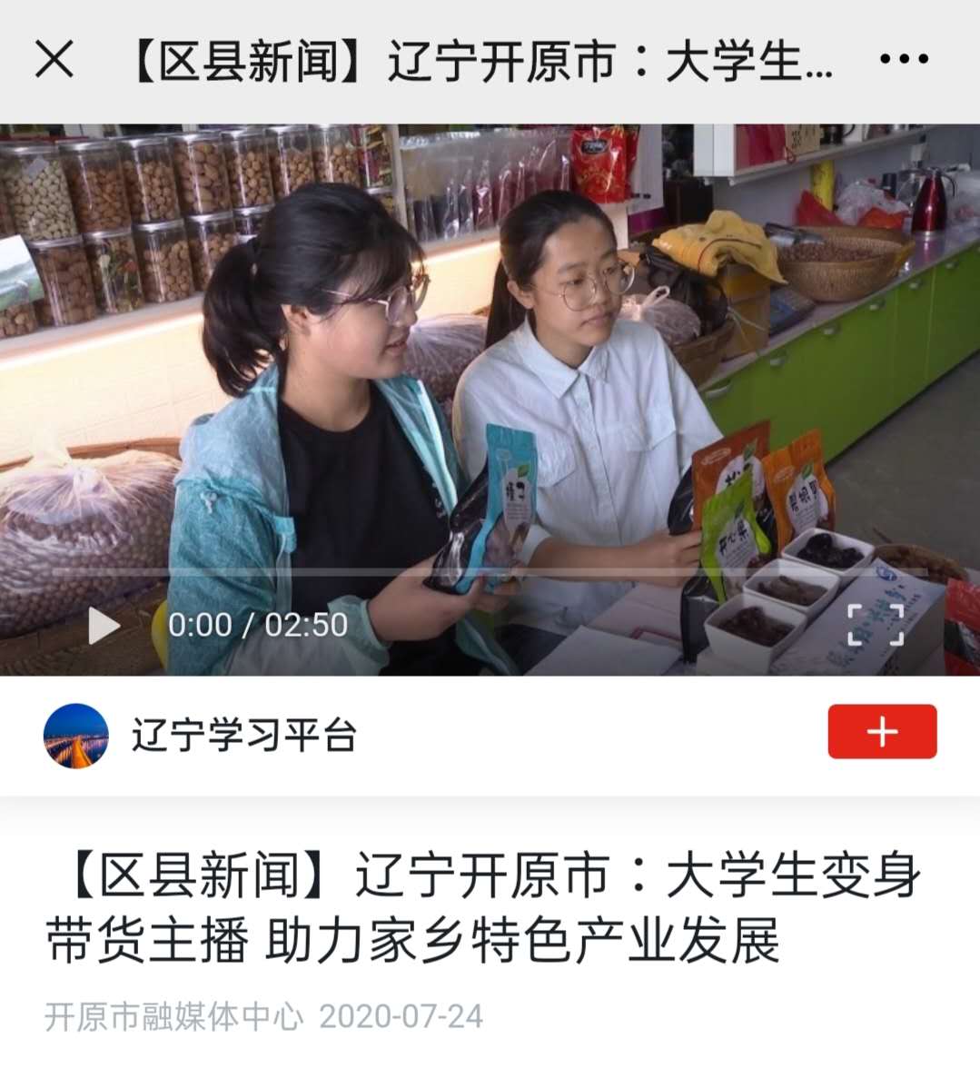 2020年7月24日,学习强国以“【区县新闻】辽宁开原市:大学生变身带货主播,助力家乡特色产业发展”为题报道了我校大学生利用电商直播平台开展扶贫助农活动,通过讲解产品的生长情况、在线试吃等方式大力推荐家乡农副产品,直播“带货”俨然已成为助力脱贫攻坚的新风口。
