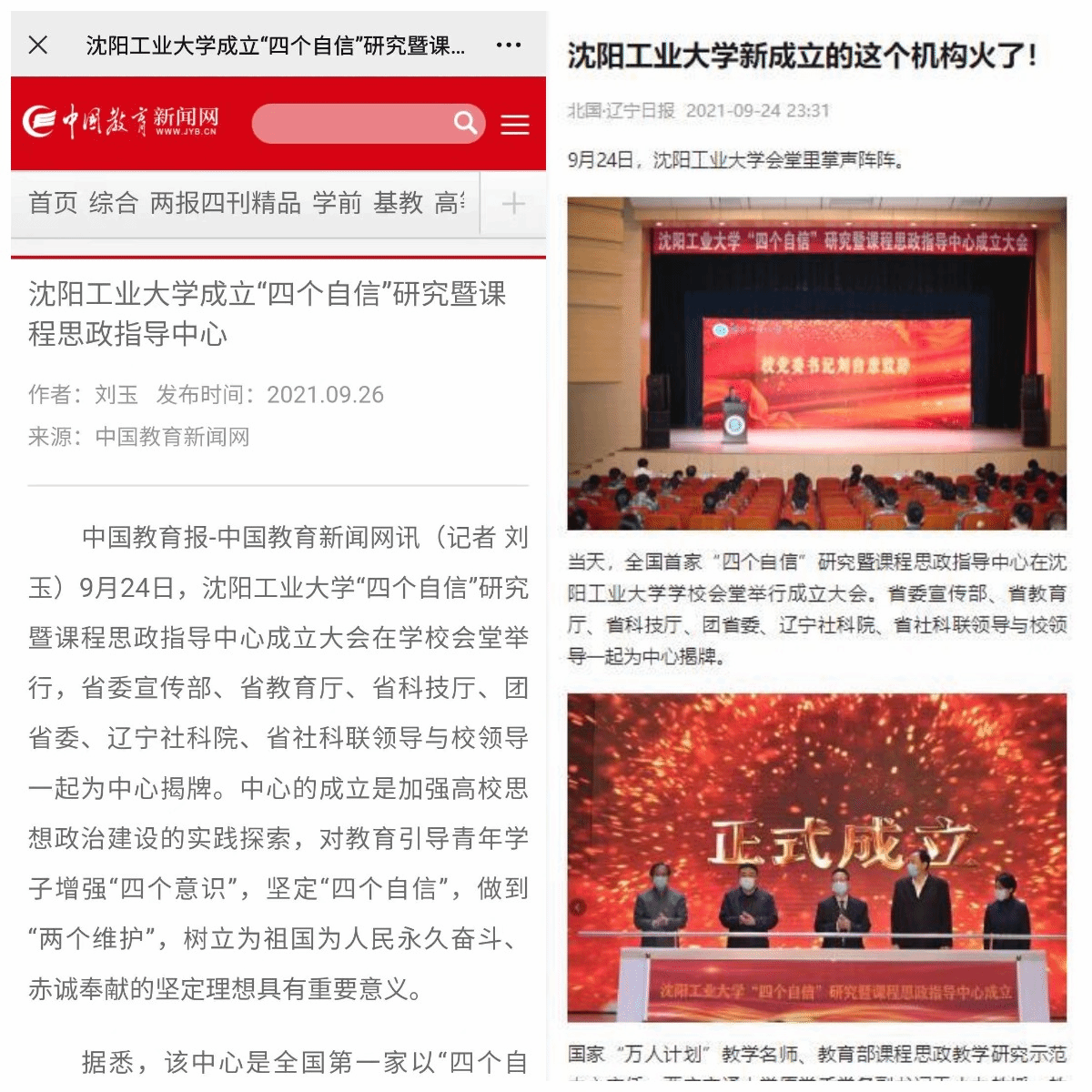 9月24日,人民日报客户端、新华网、光明日报客户端、中国青年报客户端分别报道了我校成立“四个自信”研究暨课程思政指导中心。同时,中国教育报、辽宁日报、辽宁日报客户端也分别于9月25日和9月26日对此中心的成立进行报道。此外,辽宁卫视还于9月25日播出我校“四个自信”研究暨课程思政指导中心成立大会现场盛况。