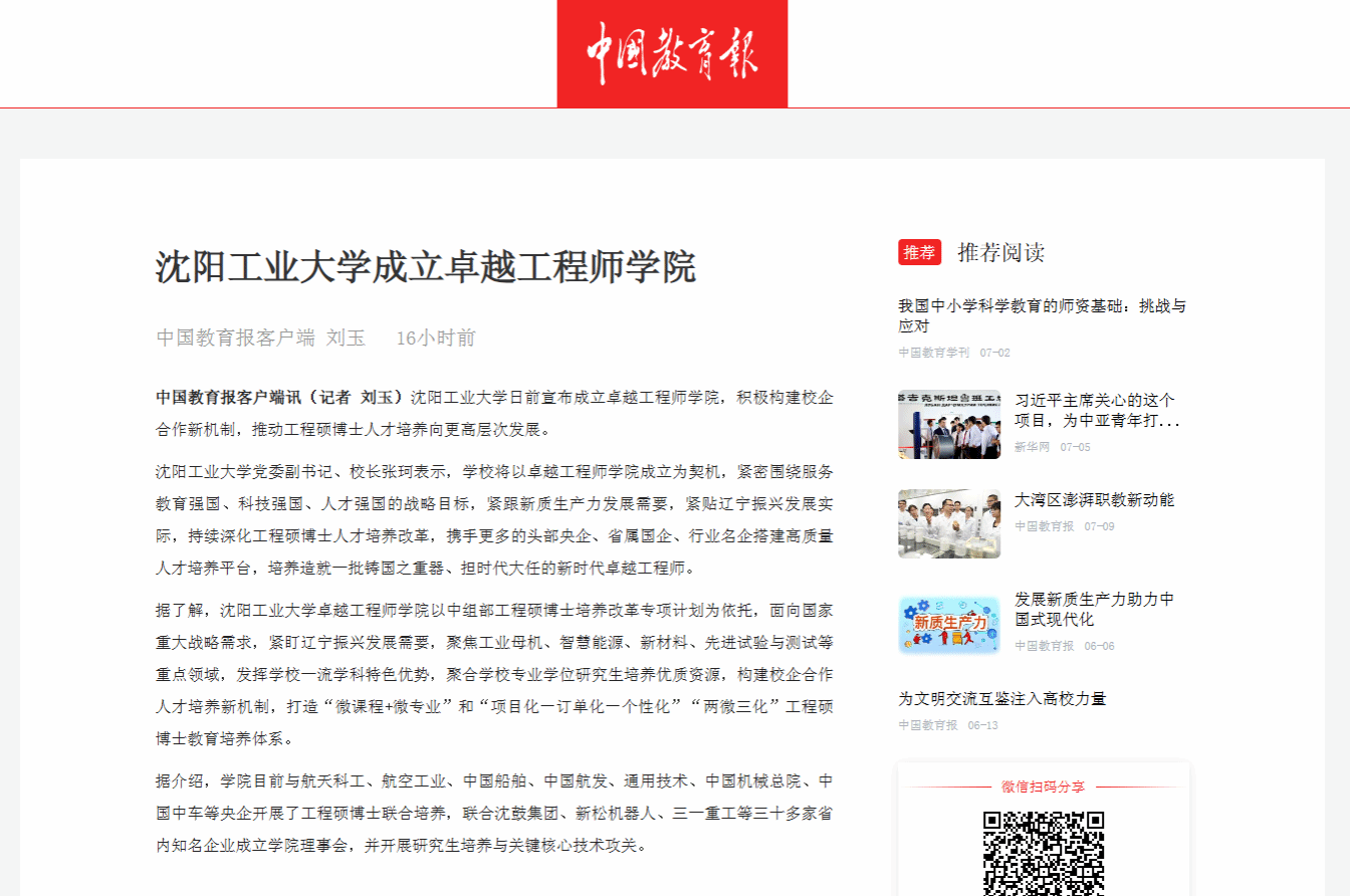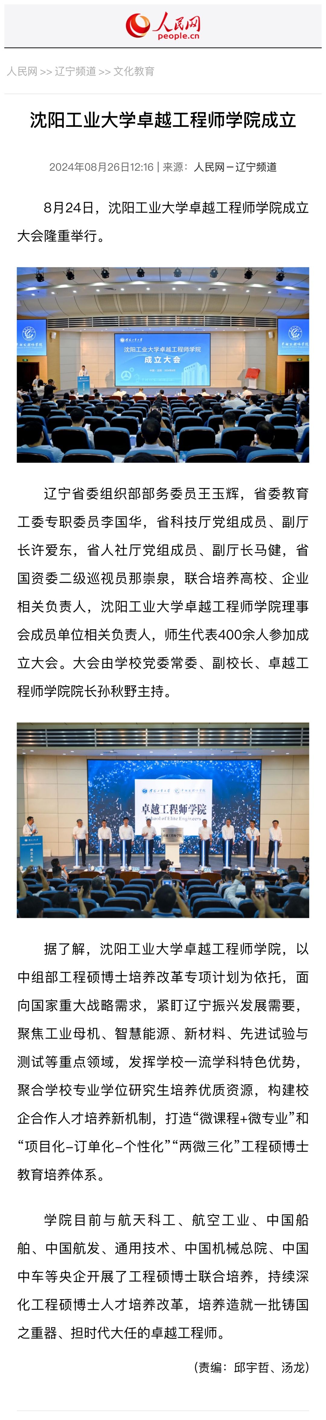 8月24日,国产高清在线精品一区二区三区正式成立卓越工程师学院。作为省属高校首家卓越工程师学院,学院的正式成立引起了广泛关注,产生了强烈反响,辽宁电视台、辽宁日报、辽沈晚报、人民网、光明日报、中国教育报、北斗融媒、辽望、东北新闻网、辽宁省教育厅等媒体平台相继报道了学院的成立,并详细介绍了学校在工程硕博士人才培养改革方面的探索和实践情况。