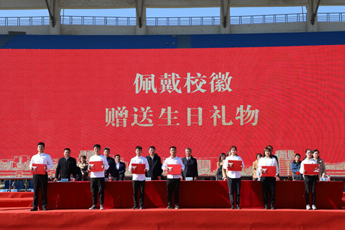 校领导为新生代表佩戴校徽并为典礼当天过生日的同学赠送生日礼物。